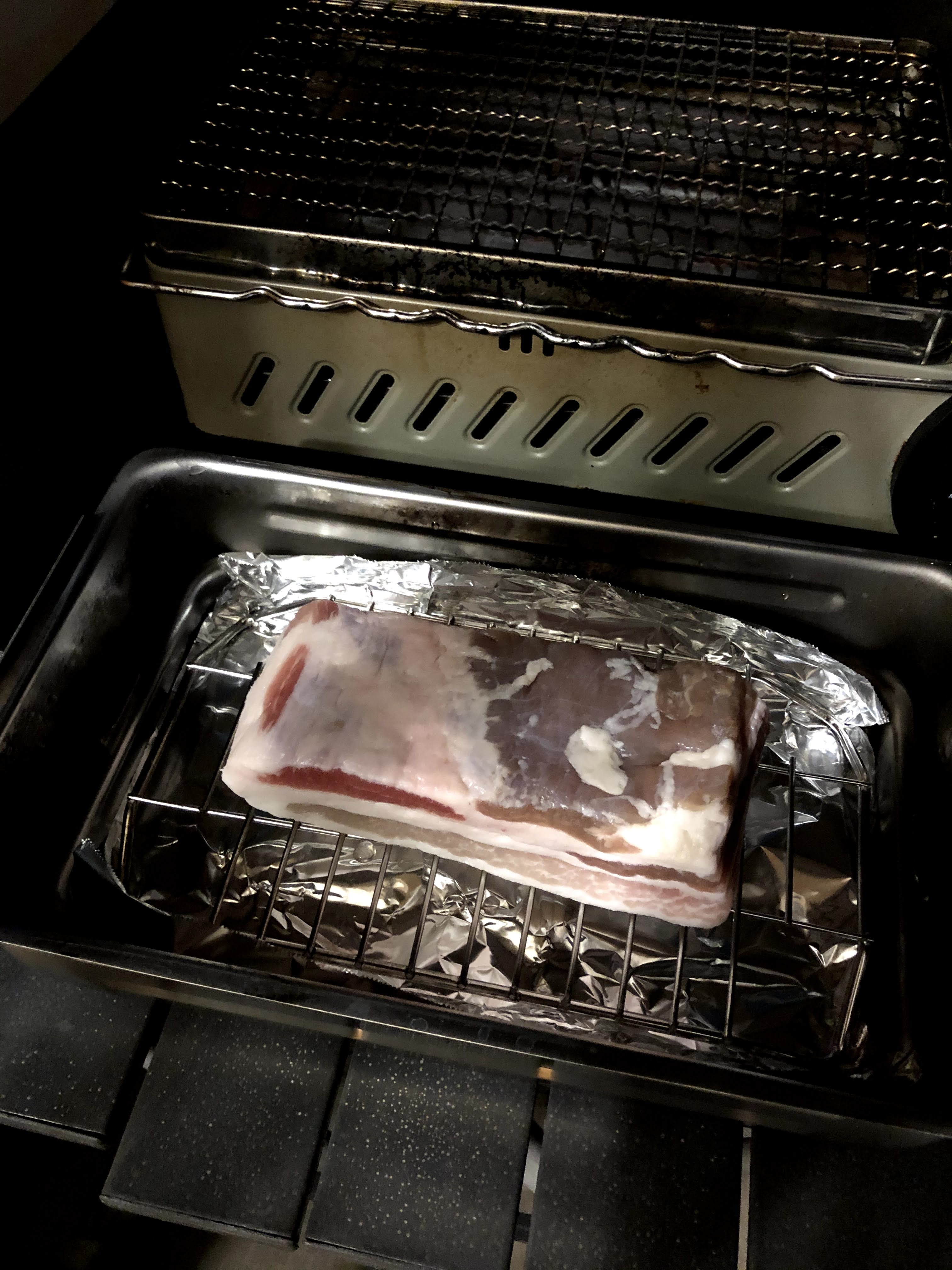 塩漬け肉をつかってスモーカーで自家製ベーコンを作ることができます。分厚い三元豚バラなわではの食べ方ですね。スモーカーでは、まず油肉面からスモーク20分、その後ひっくり返して20分の合計40分のスモークでジューシーな自家製ベーコンが出来上がります。ベーコン作りのための小型スモーカーも別の機会に詳しく書かせてください。