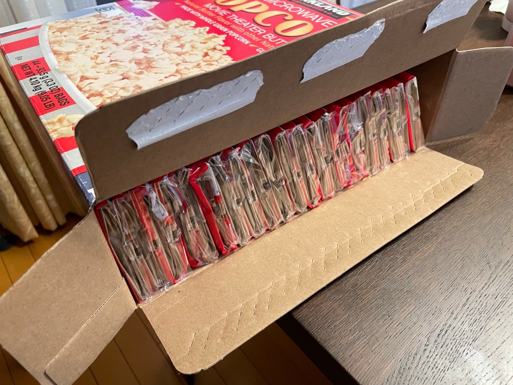 そうです。この塩とバターの加減がとってもアメリカンなポップコーンです。見かけはポップコーンなんて見えないスリムな姿をしてますよね。こいつがこんな箱に詰まって売ってます。なんと44個入りです。