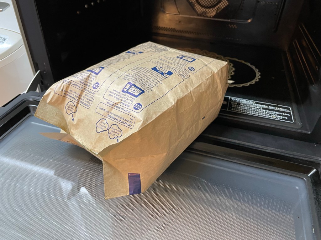 この一袋をレンジで3分〜4分チンすると出来上がります。表示にはHighで2〜3分と書いてあるのですが、日本の電子レンジだと3分でも結構不発が残ってしまいます。アメリカンな電子レンジは強力なのかな?