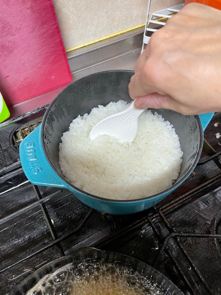 追加投稿します!ご飯を炊いてみました。なぜか蓋を開けて煮てから蓋を閉じて10分極弱火、そのあとむらしで10分という変わった炊き方ですが、とても旨い!