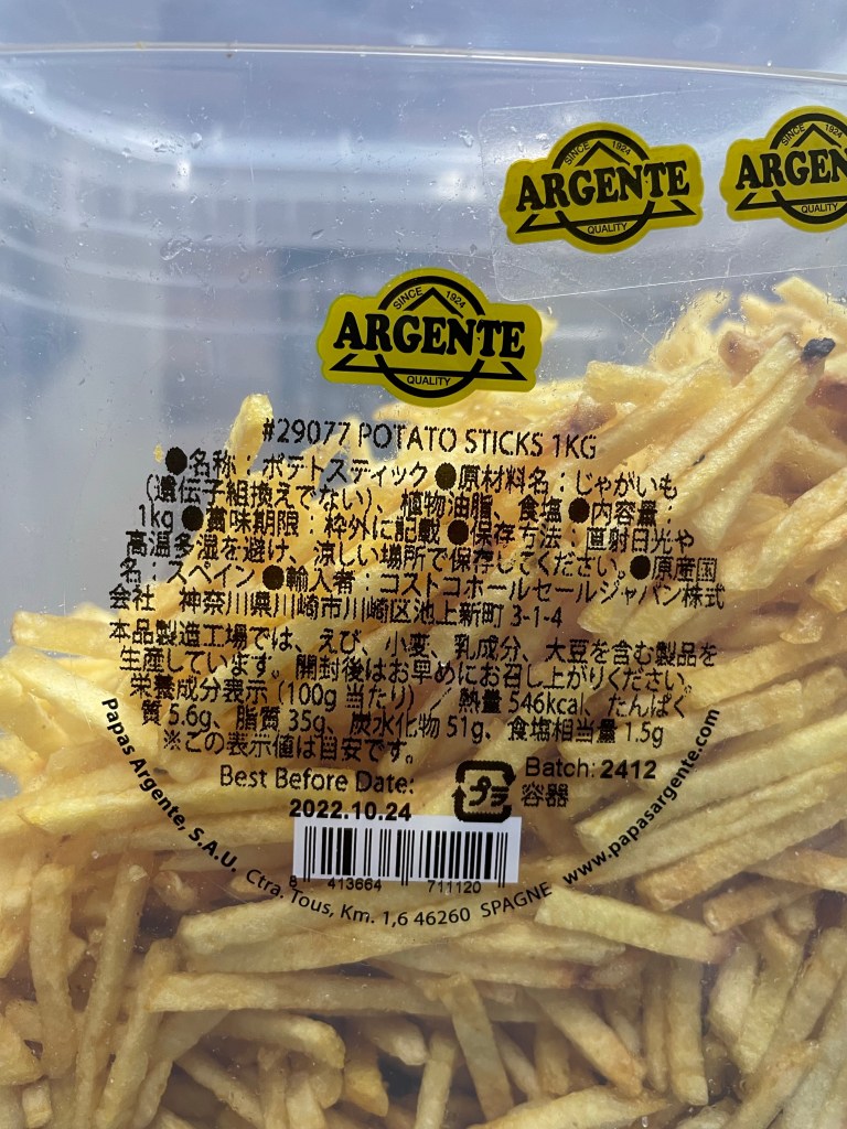 パッケージは極々シンプルでプラスティックケースにブランド名なんでしょうか?ARGENTE(フランス語で銀という意味らしい)のシールと商品詳細ラベルに小さく「ポテトスナック」と書いてあります。それ以外の商品名は無し!素材は遺伝子組み換えしてないポテト!油、食塩のみ。シンプルなお菓子です。