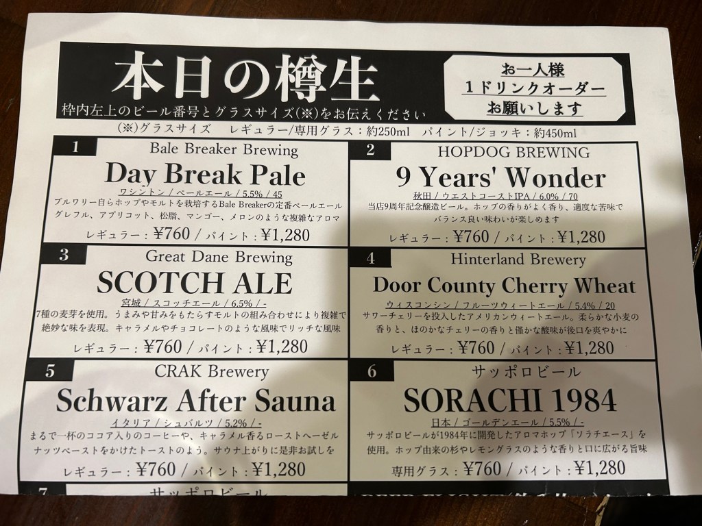 今日の樽生ビールから秋田や東北にゆかりのビールを選びました。秋田のHopdog Brewingさんの9 Year’s WonderというウエストコーストIPAと宮城のGreat Dane BrewingさんのSCOTCH ALEをいただきました。