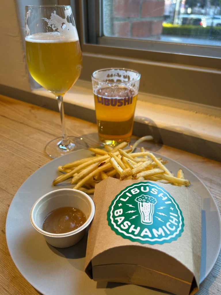 里武士さんは料理もとても美味しいです。メニューはビールのおつまみがほとんどですがどれも美味しい。このポテトは絶品でした。細身のポテトはカリカリでビールをじっくり味わってても、冷めてもいつまでもクリスピーなんです。このソースも甘酸っぱいりんご?ソースで絶品。ラベルも含めて全て自家製ですねー