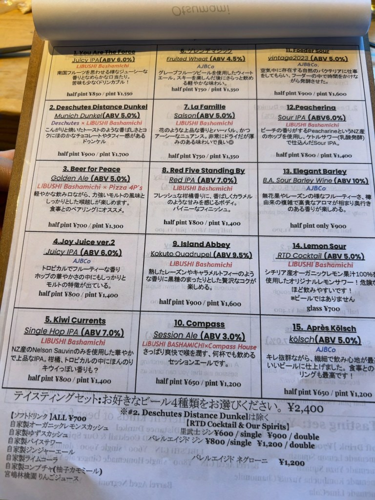 里武士のビールは直醸造所のものばかりなのですがとても種類が豊富です。この日のメニューはこんな感じの15種類。その他にも自家製ジンやクラフトビールも缶や瓶での販売もあります。地方発送もしてくれるそうです。