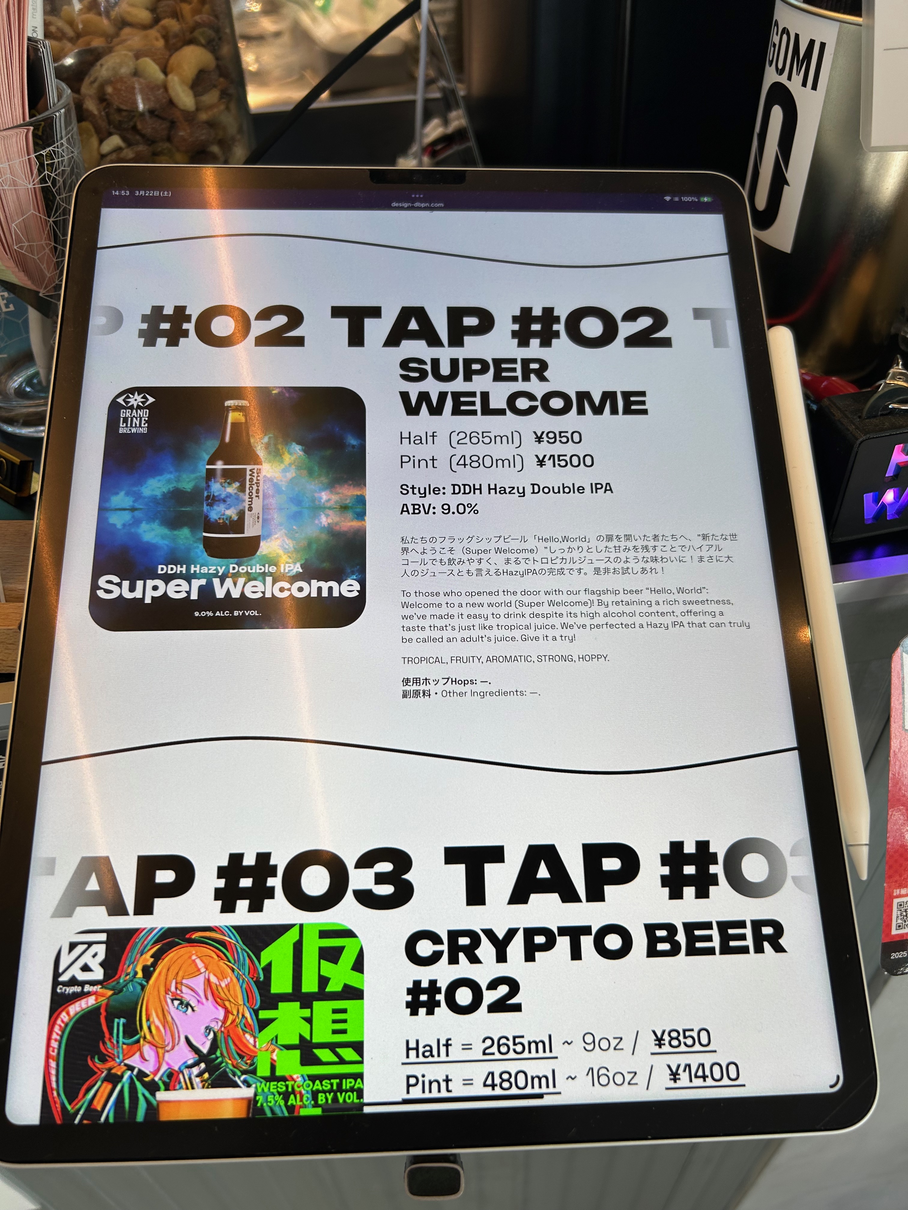 - Super Welcome(上写真左):DDH Hazy Double IPAでABV9.0%と濃厚な柑橘系のテイストで飲みやすいのですが一杯でしっかり酔える最初の一杯に最適なIPAでした。