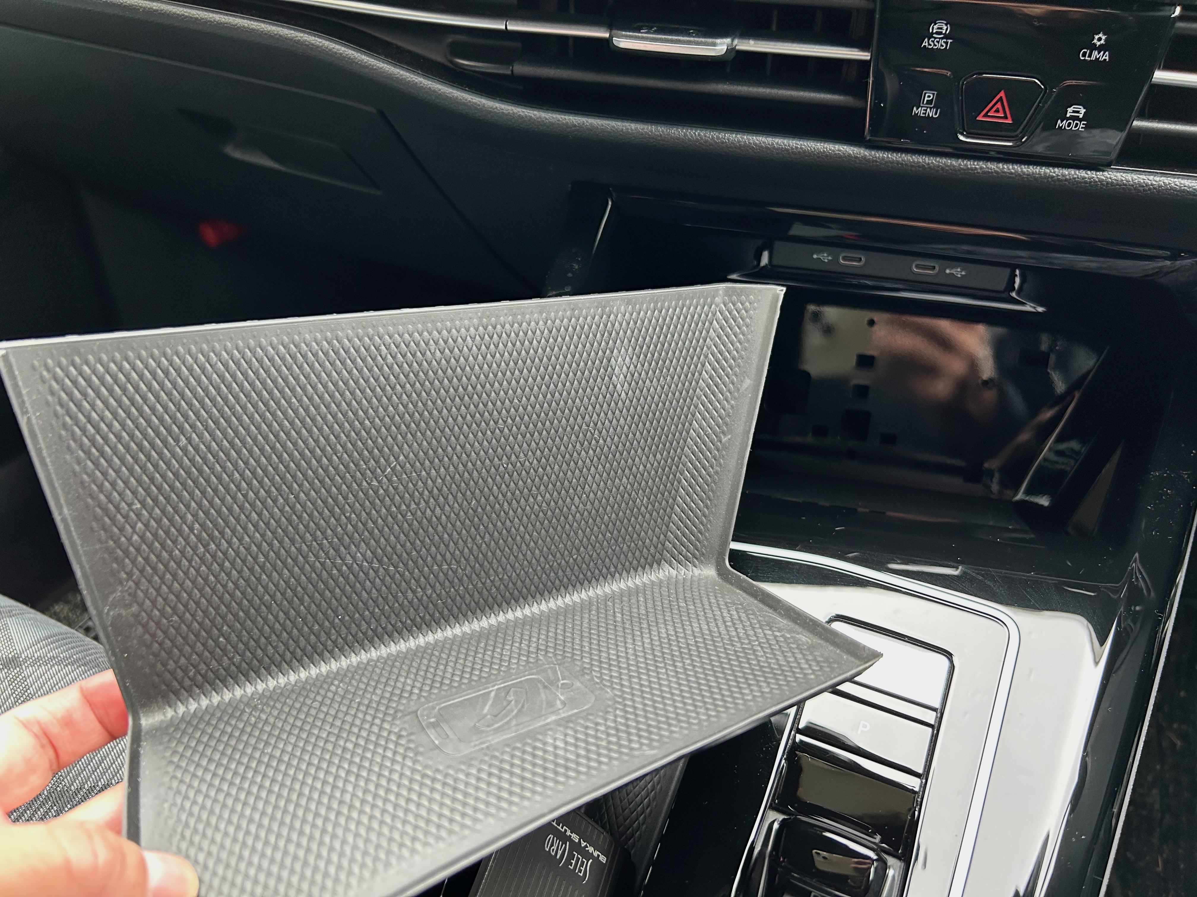 室内のゴミが溜まりそうなエリアとして収納部分があります。収納部分に細かなゴミ屑や埃が溜まりやすいものです。掃除機ですうこともできますがいまいちチリが残りますし、濡れ雑巾で拭いてもやはりチリはうまくとれないですよね。Golf8の場合は収納部分をみると底面にラバー素材が利用されています。